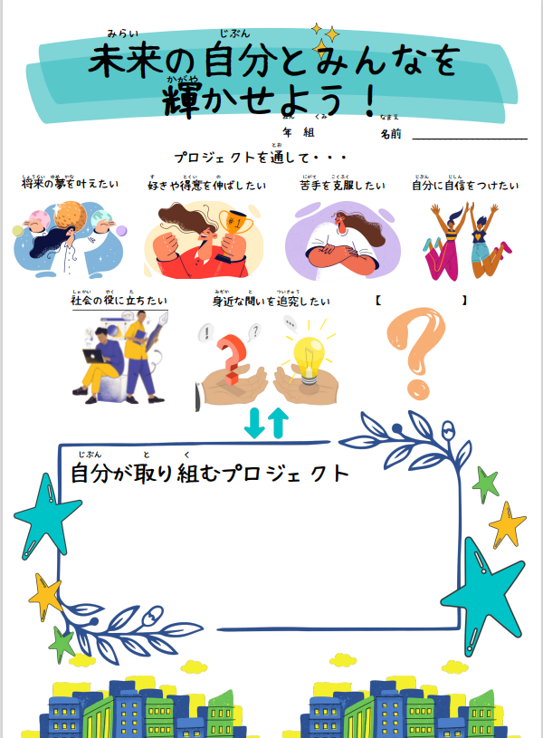 共通テーマ「自分やみんなを輝かせよう」を目指して、自分が興味関心をもったことに対して課題を設定し、その問題を自ら解決していく学習を通して、課題解決に必要な知識・技能や資質・能力を身につける探究学習が始まりました。