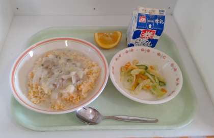 キャロットライスは、すりおろしたにんじんを加えてごはんと一緒に炊いてつくります。オレンジ色がきれいなごはんです。その上にクリームソースをかけて食べます。