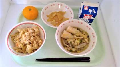 ご飯をすりこぎですりつぶし、芯にした棒ににぎりつけて焼いたものを、秋田では「きりたんぽ」とよびます。みそをぬって「みそ焼きたんぽ」としても食べますが、もっとも有名なのは、鍋物に入れた「きりたんぽ鍋」です。今日はそれをイメージした汁物にしました。「きりたんぽだっ!」と声をかけてくれる児童さんも多かったです。