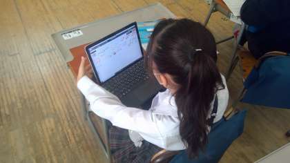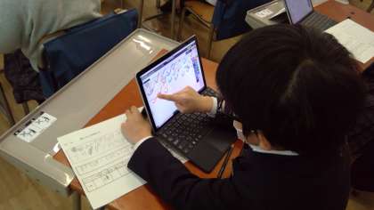 算数「しりょうのせいり」では、タブレットを使ってテーマにそった答えを投票し、投票したものをもとに表とグラフに表しました。