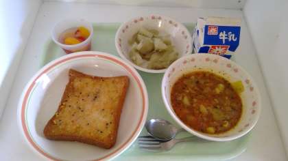 食パンを使い、エビのすり身を塗り、揚げました。そこにお酢とはちみつで作ったスイートチリソースを塗るレシピでした。ゼリーも果物のカットからスタートし、給食室は大忙しでした。アジア料理のワンダフルは初めてだったので、新しい味であったと思います。