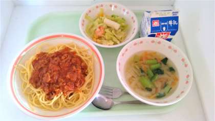 今日はスパゲッティーのソースには生のトマトも少し使用しました。ジュースなどの加工品も使用した、トマトのうまみがたっぷり入ったソースになりました。