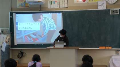 自分でできるようになったことを台本にまとめて、タブレットで撮影した動画や写真をみんなに見せながら紹介しています。映像があると分かりやすく、発表も堂々としていますね。