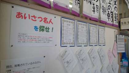 5年生の廊下にはあいさつ名人の賞状が貼ってあります。いつでも、どこでも、自分から元気にあいさつができることを目指して、みんなで頑張っています。