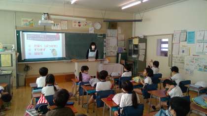 養護教諭の先生が、保健室のよりよい利用の仕方やけがの応急処置について授業をしました。