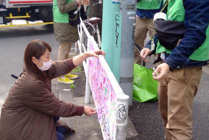 代官山クラップ 取付 公開日 2021/02/12 更新日 2021/02/12 学校生活の様子 図工の先生と副校長先生で放課後に横断幕を取り付けに行きました。他にも取り付けに来ている団体の方々もいました。全部そろうのが楽しみです。