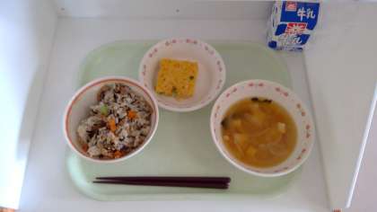 ひじきは鉄やカルシウムなどが含まれいるので、児童の皆さんに摂ってもらいたい食材の一つです。給食ではひじきを油揚げなどと煮て、炊きあがったごはんと混ぜ合わせて作りました。味付けは少し甘めでよく食べてくれていました。