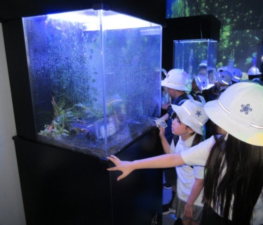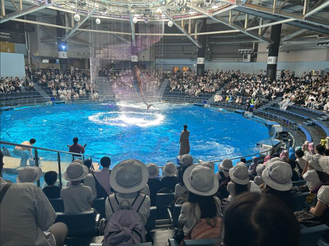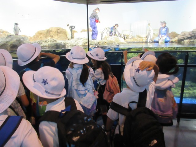 校外学習でマクセルアクアパーク品川に行きました。ペンギンのライブビューイングをみたり、ペンギンやドルフィンのパフォーマンスを見たりしました。パフォーマンスでは、ペンギンやイルカが技を決めると「おお~!!」「すごい!!」などと、歓声を上げながら楽しく見学しました。その後、グループごとに見学しました。2年生になって初めての班行動でしたが、班長をはじめとした全員が時間を守って行動することができていました。国語で学習した「スイミー」にちなんで、「ドロップみたいな岩」や「カラス貝よりも真っ黒な魚」などを見つけた子もいたようです。水の中で暮らす生き物に興味を持ったことを、他の学習にも繋げていきたいと思います。