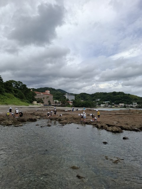 今井浜海岸、快晴の下磯遊びをしました。ちょうど干潮時。潮溜まりで生物の観察に歓声が上がります。