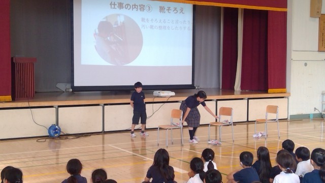 環境委員会は、子どもたちが気持ちよく一日を始められるよう、朝の挨拶運動や、上履きがきちんと揃えられるよう声かけをしたり、乱れた上履きを直したりと、日々の学校生活を支えてくれています。