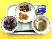 ビビンバ丼わかめスーププレミアムスイートポテト牛乳【給食のおたより】今日の給食は...