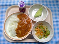 今日のこんだて・キーマカレー・オニオンドレッシングサラダ・紅まどんな・牛乳今日の...