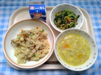 今日のこんだて・鶏五目ご飯・フライビーンズサラダ・ナタデココポンチ・牛乳今日のナ...