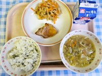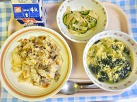 今日のこんだて・豚肉とごぼうのおこわ・大根とじゃこのサラダ・かきたま汁・牛乳今日...