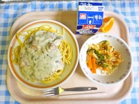 今日のこんだて・スパゲティクリームソース・パリパリサラダ・カラマンダリン・牛乳今...