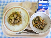 今日のこんだて・焼鳥丼・じゃがいものきんぴら・ピーチサイダーゼリー・牛乳焼鳥丼は...
