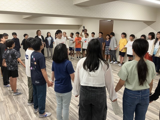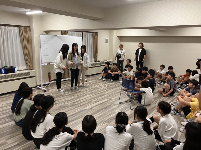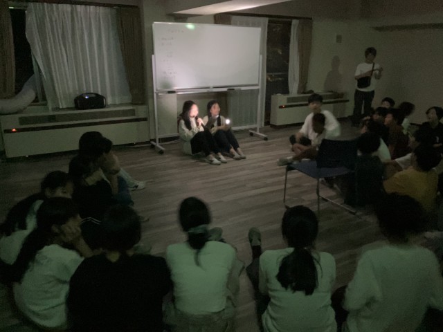 室内レクが始まりました。前半は宝島の合唱から、イントロクイズ、そして怖い話。