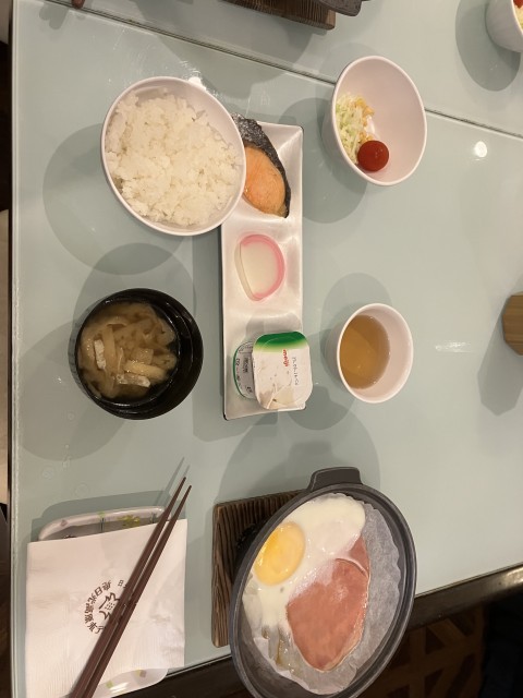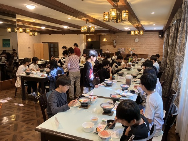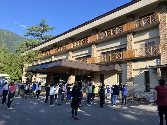 2日目になりました。ラジオ体操で気持ちよくスタートです。いっぱい食べてハイキングに備えます!
