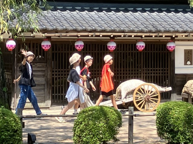 日光江戸村で、好きなものを食べたり、お土産を買ったり、グループで楽しく過ごしています。今日の江戸村は比較的空いていて、たっぷり遊べそうです。