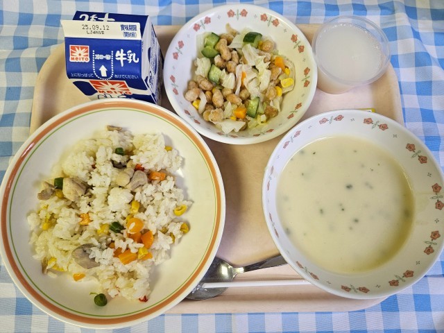 今日はじゃがいもをたっぷり使ったポタージュを作りました。じっくり炒めた玉ねぎの甘みとじゃがいものとろみがおいしかったです。ほとんどのクラスが残さず食べてくれました♪台風が近づき、気温も少し下がっているのでポタージュで体があたたまるといいですね。