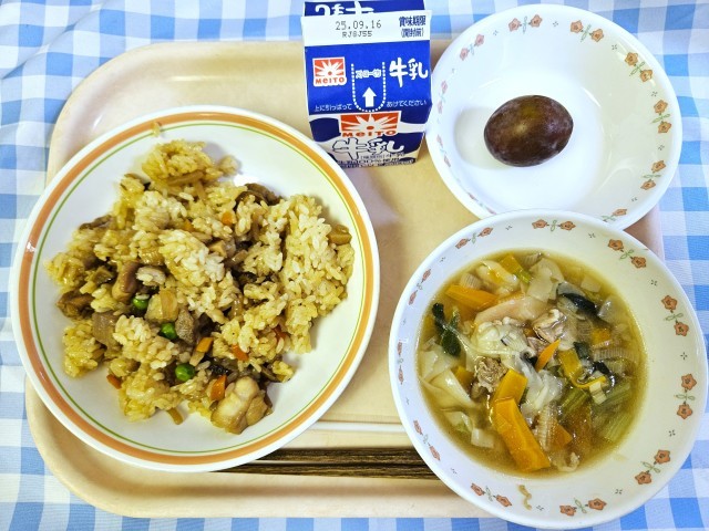 今日のデザートは長野県産のサンプルーンでした。「西洋すもも」とも呼ばれていて、赤紫色の皮と黄色い果肉が特徴です。子供たちからは「大きなぶどうだ!」「ぶどうみたいな味がするんですか?」と言われました。食べてみてどうだったかな?
