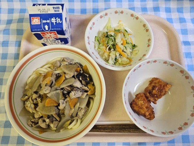 9月16日(火)きゅうしょく 公開日 2025/09/16 更新日 2025/09/16 給食日記 今日のこんだて・けんちんうどん・鶏天のごまだれがけ・じゃこ入り即席漬け・牛乳今日はおかずに鶏の天ぷらを揚げました。天ぷらと唐揚げは「衣」をつけて揚げるか、「粉」をつけて揚げるかで名前が変わります。サクサクの衣がついた鶏天、美味しかったですね。