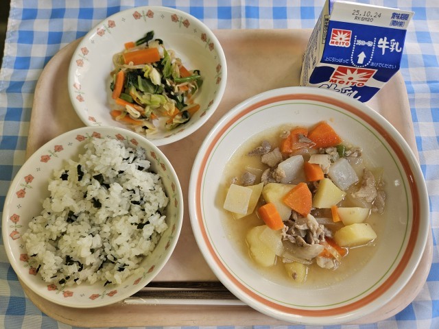 10月17日(金)きゅうしょく 公開日 2025/10/17 更新日 2025/10/17 給食日記 今日のこんだて・わかめご飯・塩肉じゃが・梅和え・牛乳今日の肉じゃがは、醤油を使わずに味をつけました。塩こうじ、塩、みりんで優しい味付けにしています。お肉も柔らかくなり、野菜のうまみと甘みが引き出されておいしくできました♪わかめご飯も大人気で、ほぼ残さず食べてくれました!
