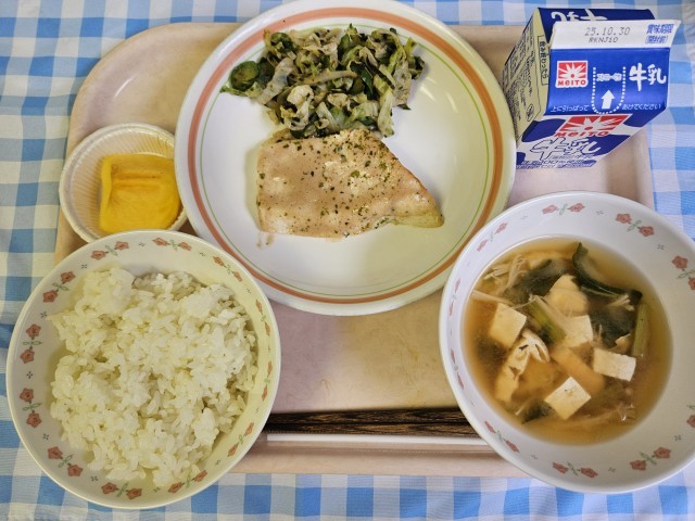 今日は季節の果物「柿」を出しました。さっぱりした甘さで食べやすく、完食しているクラスが多かったです。かじきのお好み焼きは、なかなか焼き魚を食べてくれない子も食べてくれました。くせの少ないかじきまぐろの身と、中濃ソース+マヨネーズの味の強さでお魚感が少なく食べられました。