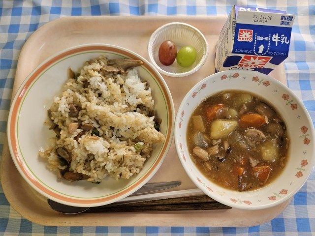 今日は秋らしく、舞茸ご飯を作りました。スープに入っているきのこは嫌がられることが多いのですが、味を良くしみこませてご飯の具にしたことで、ほぼ残さず食べられました。鶏肉のうま煮も、とろみのついた生姜風味の味付けで体があたたまりました。ぶどう食べ比べは「シャインマスカット」と「クイーンルージュ」の2種類でした。シャインマスカットはさわやかな甘みがおいしく、クイーンルージュはシャインマスカットよりも味が濃く、香りもしっかりしていました。