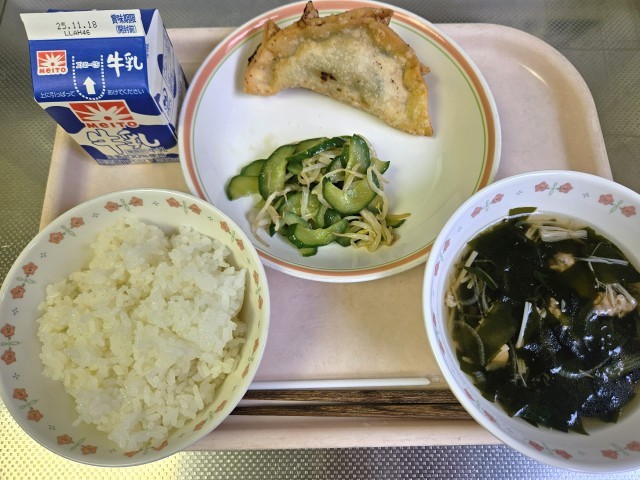 今日のご飯は「ひとめぼれ」です。ひとめぼれはコシヒカリと初星の交配で作られたお米のため粘りがあり、ふっくらと炊きあがります。いつもより後味に甘みがあり、おいしいお米でした。揚げ餃子も人気のメニューなので、今日は白米がよく進んでいるように感じられました!
