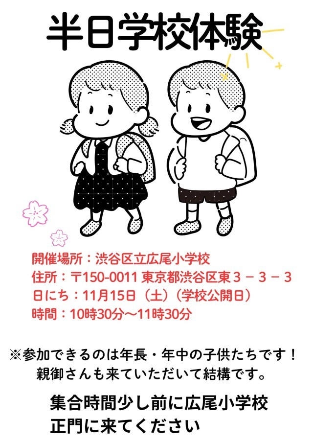 シブヤ未来科「学校体験会チーム」が、学校公開で保護者の方と一緒に広尾小学校に来る未就学児(年中・年長さん)を対象に、学校体験会を行います。ぜひ、多くのお子さんに参加していただけたらうれしいです。