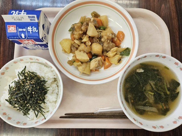 12月1日(月)きゅうしょく 公開日 2025/12/01 更新日 2025/12/01 給食日記 今日のこんだて・ご飯・海苔の昆布茶ふりかけ・魚と野菜の揚げ煮・法蓮草のみそ汁・牛乳今日の「魚と野菜の揚げ煮」に使ったお魚はホキという白身のお魚です。献立名にお魚の名前を載せなかったので低学年には何の魚かあてながら食べてもらいました。