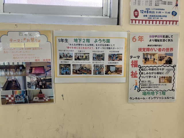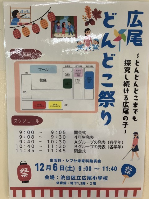 12月6日土曜日は生活科・シブヤ未来科発表会のどんどこ祭りが開催されます。廊下には各学年で作成されたポスターが貼られ、準備が進んでます。ご参観お待ちしております。