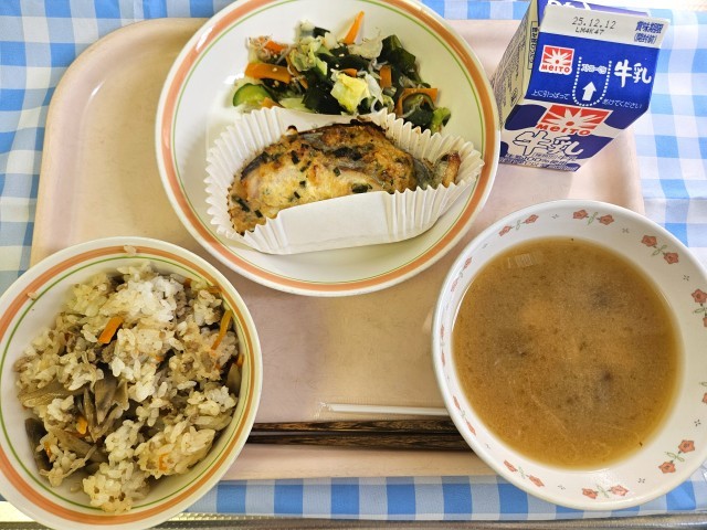 12月9日(火)きゅうしょく 公開日 2025/12/09 更新日 2025/12/09 給食日記 今日のこんだて・きんぴらご飯・さわらのみそマヨネーズ焼き・じゃことわかめの和え物・豆腐となめこのみそ汁・牛乳みそマヨネーズ焼きは、赤みそとエッグケアマヨネーズ、玉ねぎのみじん切りと小葱を合わせてかけ焼いています。いい焼き色がついておいしくできました♪