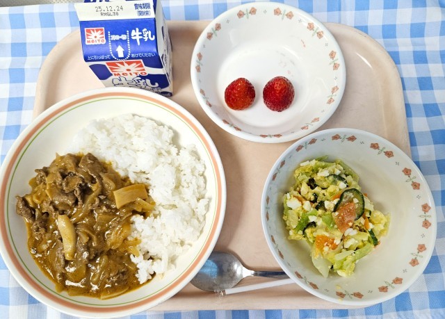 ビーフストロガノフは、たくさんのたまねぎと牛肉のうまみが引き出されていてとても美味しくできました!具材には小さく切ったエリンギを混ぜ込みましたが、気づかずに食べてくれました。いちごは栃木県の「とちあいか」です。旬にはまだ早いハウス栽培のイチゴですが、香りがよくておいしかったです。