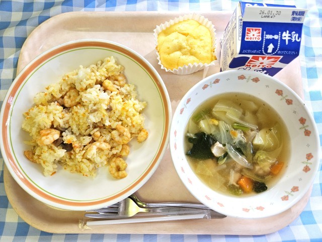 今日は国産のしばえびをたくさん使ったえびピラフを作りました。バナメイエビよりも上品な甘さがあり、あっさり優しい味で食べやすいえびでした!小さなベーコンやセロリがえびの味を引き立てていて、ほとんどのクラスが完食していました♪