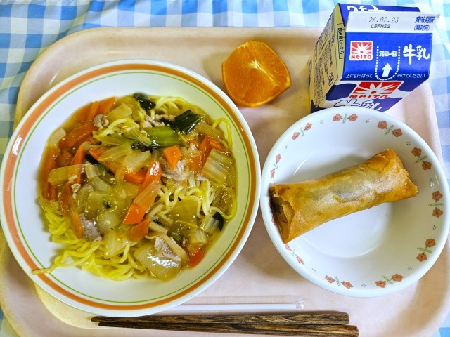 春巻きは、春先(立春)に芽を出す野菜やタケノコが具材に入ることから春巻きと言われるそうです。今日は具にしいたけを加えました。スープや混ぜご飯に入ったしいたけが苦手な子も、春巻きの中に入れたことで気づかずに食べてくれました♪