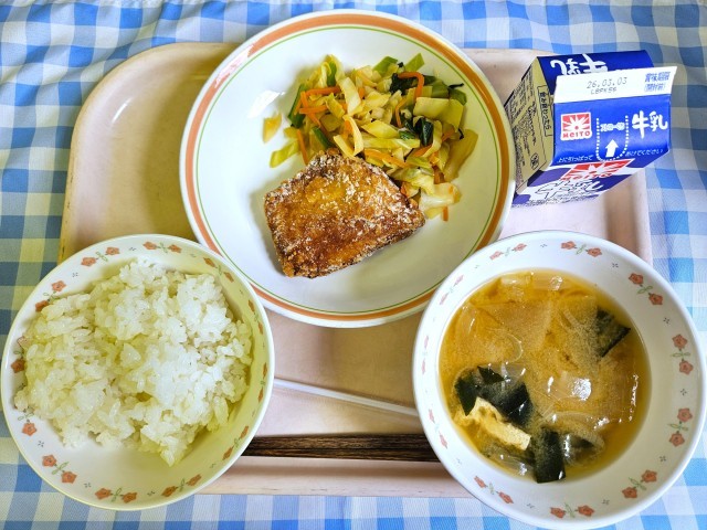 今日はめかじきを竜田揚げにしました。淡白なお魚ですが、揚げたことで油の香ばしさが加わってサクサクとおいしく揚がりました。魚が苦手でもおいしく食べられたようで、残りも少なかったです!