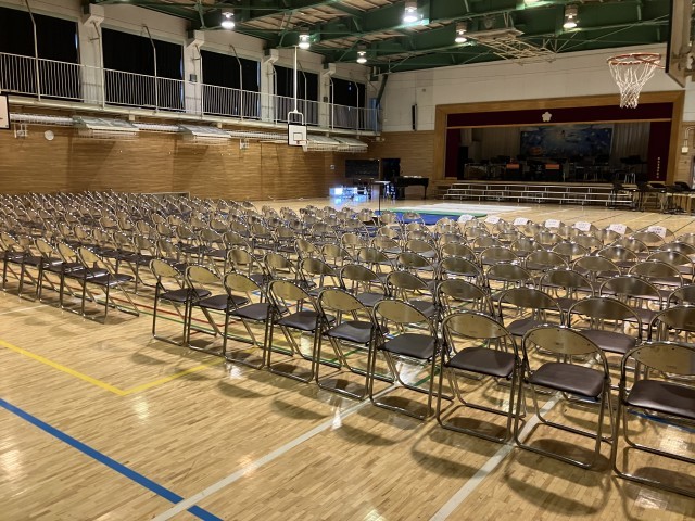 2枚目の写真のパイプ椅子席はどなたでもご使用できますが、来賓席とPTA総務役員席には表示がありますので、そちらのご使用はご遠慮ください。
