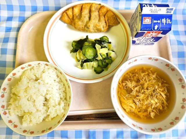 今日は6年生から、「卒業前にもう一回食べたい!」と言われたジャンボ餃子です。1つで普通の餃子4つ分程度の大きさになる、大きな餃子です。今の学年で食べる給食は、今日を含めて残り3回になりました。しっかり噛んで、よく味わって食べましょう!