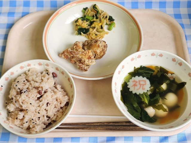 今日は今年度の最後の給食でした!6年生は明後日が卒業式ですね。給食室から卒業・進級へのお祝いの気持ちを込めて、赤飯を作りました。今日の赤飯は、小豆ではなく岡山県産のだるまささげを使いました。ささげは、豆が割れずらいことから、縁起担ぎにもなっています。