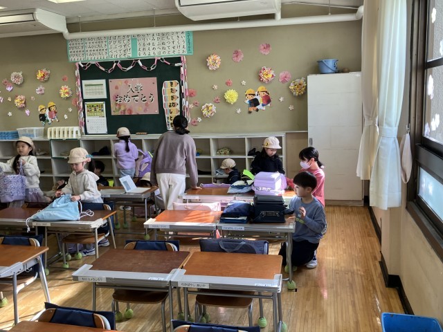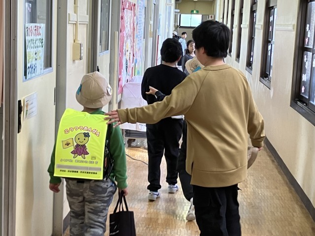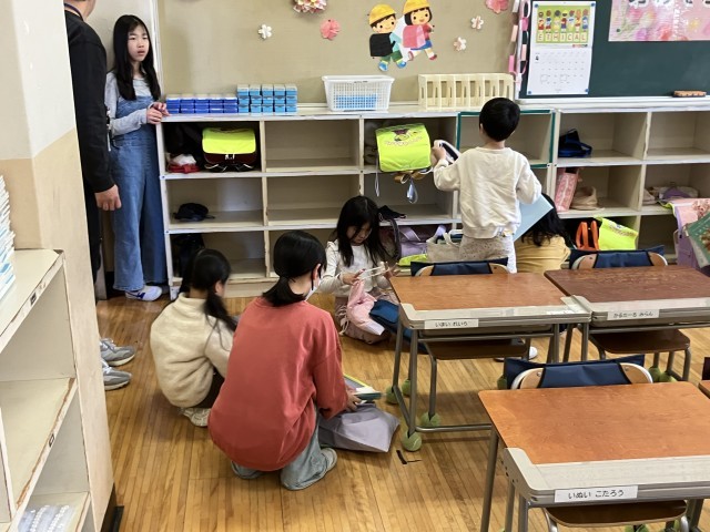 朝、1年生が登校すると、6年生がお世話をしてくれます。靴箱から教室まで連れて行ってあげたり、朝の身支度の手伝いをしたりしています。6年生は、まずは1年生が自分でやれるように見守りながら、必要なところを手伝ってあげているところが素晴らしいです。1年生も安心して一日のスタートができています。