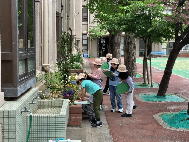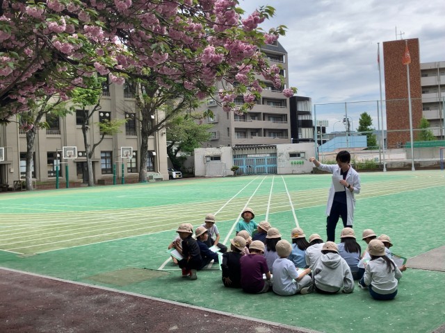3年生は初めての理科。白衣の立石先生に理科の勉強の仕方を教わったら、校庭に出て生き物探しをしました。みんな夢中になって活動しています。