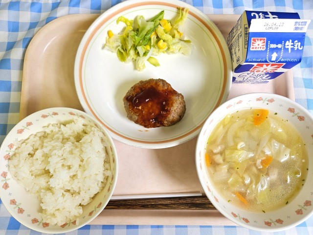今日のハンバーグにはおろした蓮根を入れて、柔らかくなるように作りました。春が旬のアスパラも、シャキシャキして美味しかったですね。1年生は初めてのABCスープで、アルファベットを探して自分の名前を作っている子もいました!