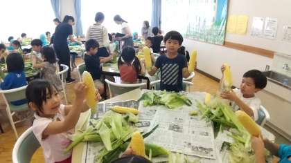 【1年生】トウモロコシのひげとり 公開日 2024/07/05 更新日 2024/07/05 お知らせ 7月2日(火)広尾幼稚園そら組さんと一緒に、トウモロコシの皮むきとひげとりをしました。最初に「旬」の意味やトウモロコシに関するクイズをしてから、皮むきのコツを学びました。トウモロコシを傷つけないように、丁寧に上手につるつるのトウモロコシになりました。今日の給食が楽しみです。