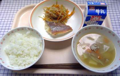 めばるとは、白身魚の一種で目が丸くて大きなところが特徴です。今日は塩こうじに漬けて焼きました。きんぴらごぼうに使っているごぼうとにんじんは約10kgありますが、調理員さんが一生懸命包丁でせん切りしてくれました。