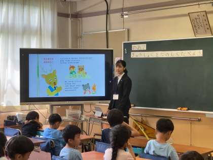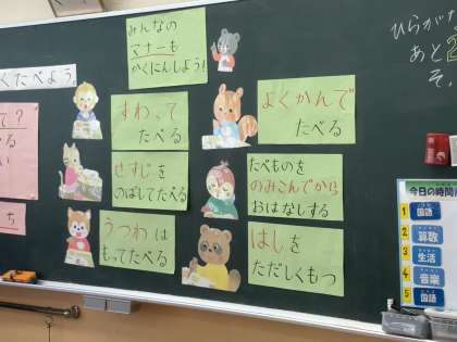 本日、教育実習生の研究授業がありました。食事のマナーについて、絵本を使って分かりやすく学ぶことができました。給食でも教わったことを生かしてマナーを守っていけるといいですね。