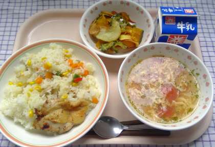 今日の給食には、とうもろこし・トマト・かぼちゃ・ゴーヤなど夏野菜をたくさん使いました。ゴーヤは苦みのある野菜ですが、チップスにすることで苦みが和らぎ食べやすくなります。残菜も少なく(全校で0.6%)みんなよく食べてくれました。