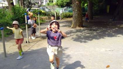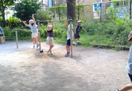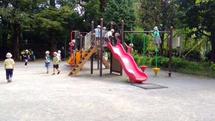 【1年生】校外学習 公開日 2024/09/10 更新日 2024/09/10 お知らせ 夏休み明けてすぐの9月3日(火)、『氷川の杜公園』に行ってきました。雨のために延期されていた校外学習にやっと行くことができました。春に出掛けた『恵比寿東公園(通称タコ公園)』との違いや、友達に知らせたいことを探しながら、遊具で遊んだり、散策したりしました。青々と葉が大きくなっていることやセミの抜け殻を見付けたり、季節の違いに気付いたりすることができました。並んで歩くことも上手になりました。