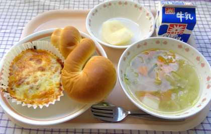 ムサカは、ギリシャの伝統的な家庭料理のひとつです。なすの入ったミートソースとホワイトソース、ピザチーズを重ね焼きにして作りました。なすは苦手意識をもつ子が多い野菜ですが、この料理なら食べられる!と言われるほど、広尾小学校で大人気のメニューです。